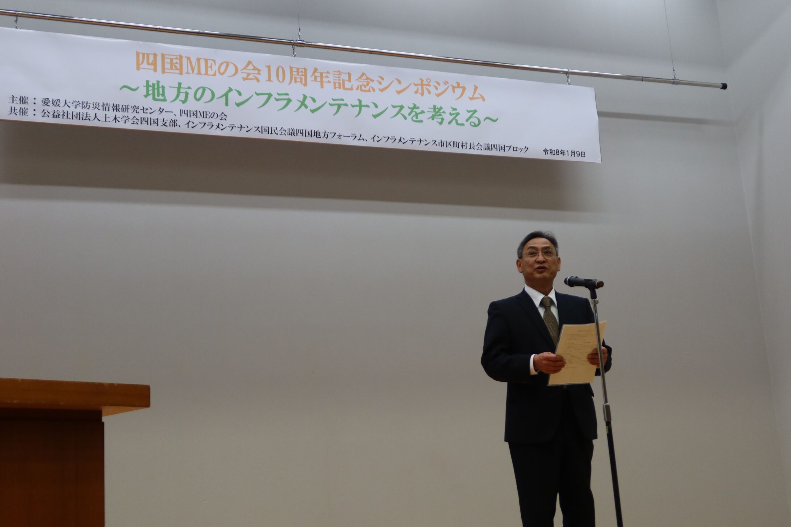 愛媛大学では、四国のインフラを支えるために、12年前の平成26年度から「社会基盤メンテナンスエキスパート(ME)養成講座」を開設し、総合的かつ高度に地方のインフラメンテナンスに携わる技術者の育成を進めてきました。その2年後に、本講座を修了した四国MEの認定者が集う「四国MEの会」(当初の愛媛MEの会から改称)が発足され、四国における地方のインフラメンテナンスに対して一体となって活動を進めています。今年度、四国MEの会は発足10周年を迎えます。その活動の節目にあたり、本シンポジウムはでは、今後の地方インフラマネジメントの改革に向けて、今できること、そして四国MEが担う役割について深く議論する場として開催されました。